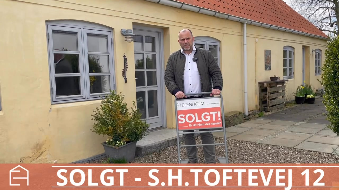 Claus har været forbi Sønder Hostrup Toftevej 12 for at skifte TIL SALG-skiltet ud med et SOLGT-skilt